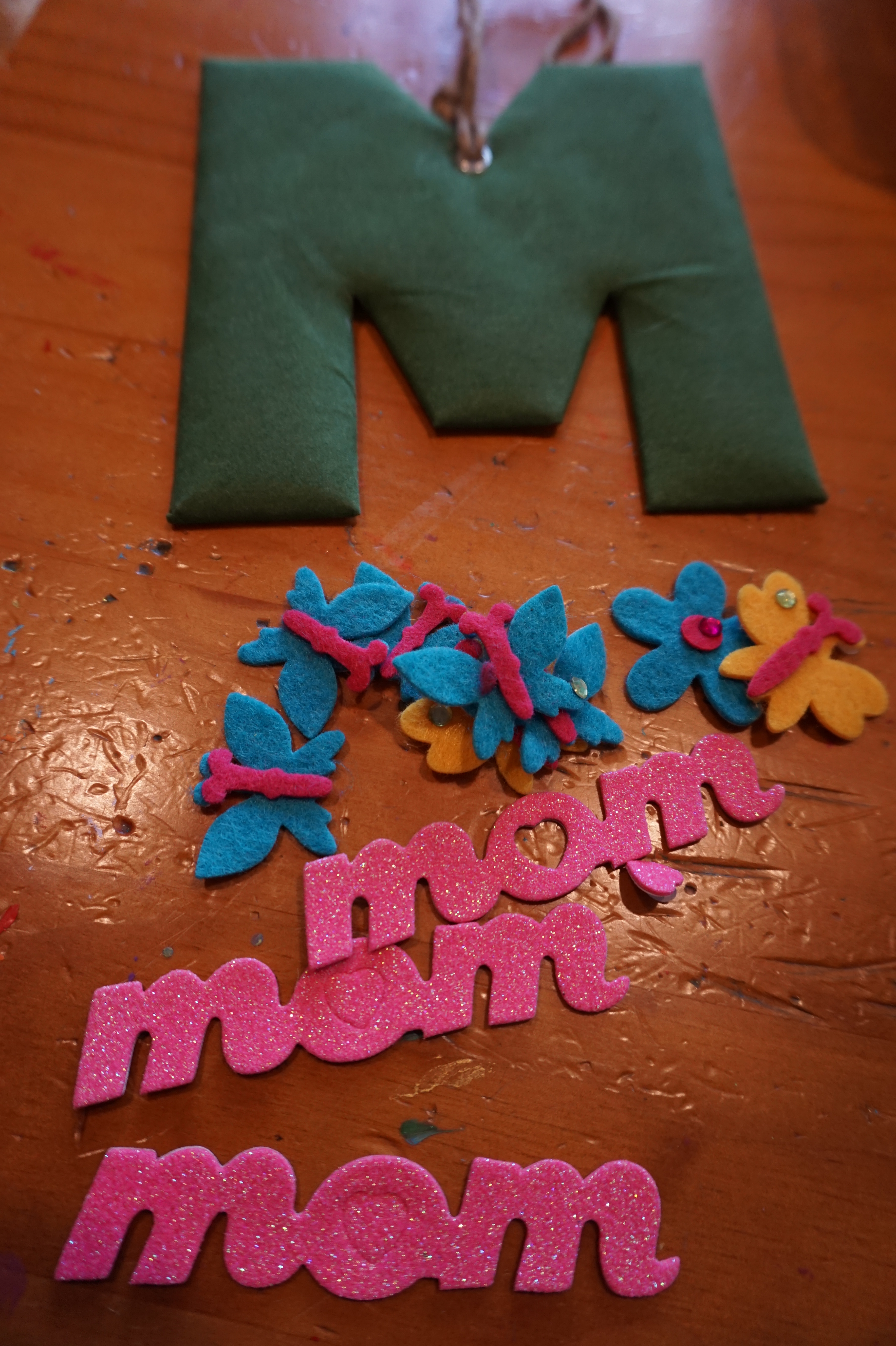 They took turns gluing on the felt M. I gave them some tacky glue to add on each piece because the adhesive on the decorative pieces usually don’t last long..so some other glue helps to secure it. I like tacky glue/ clear glue because it works on almost everything. This you can get at any craft store. I got mine from Walmart.