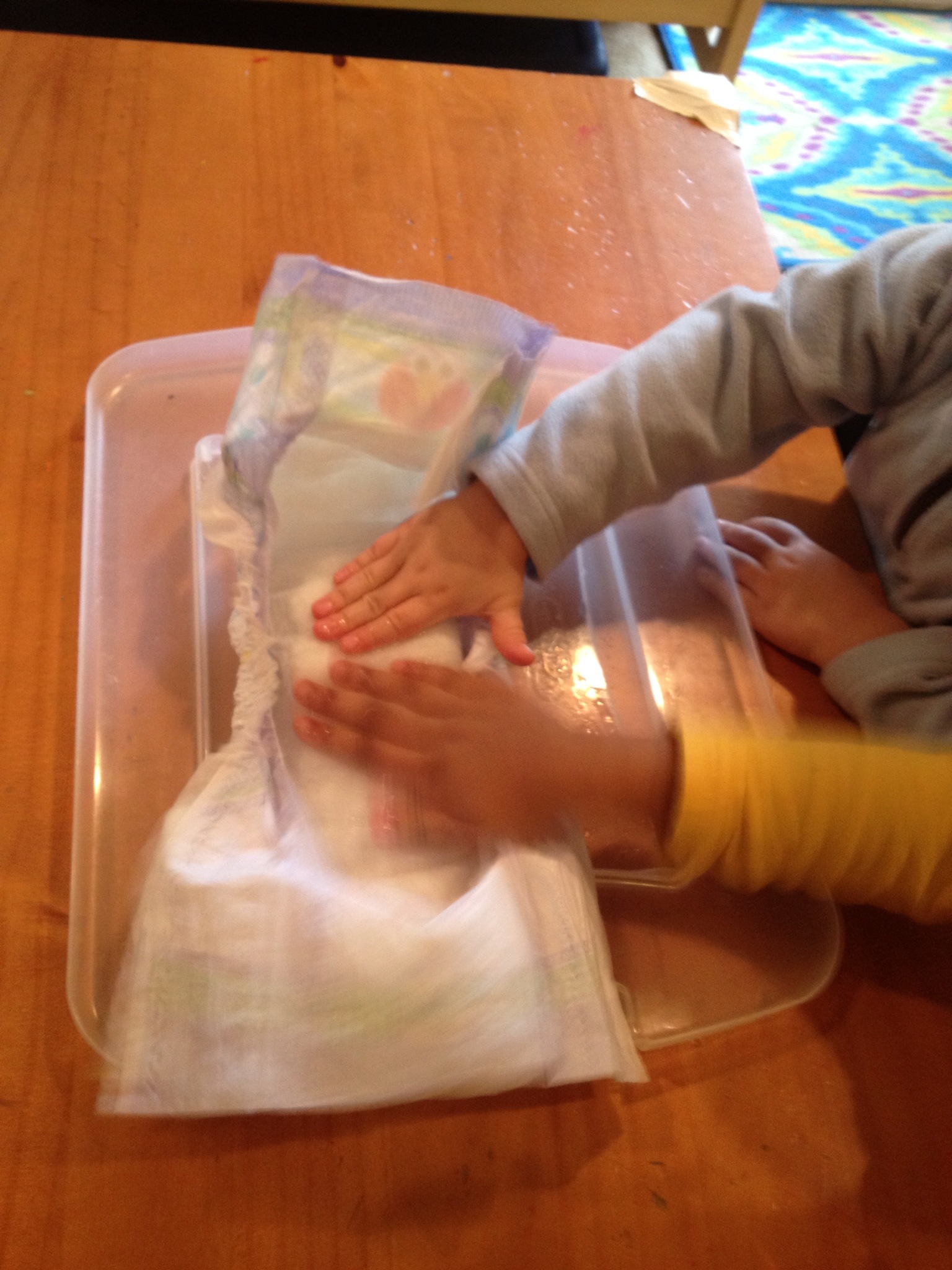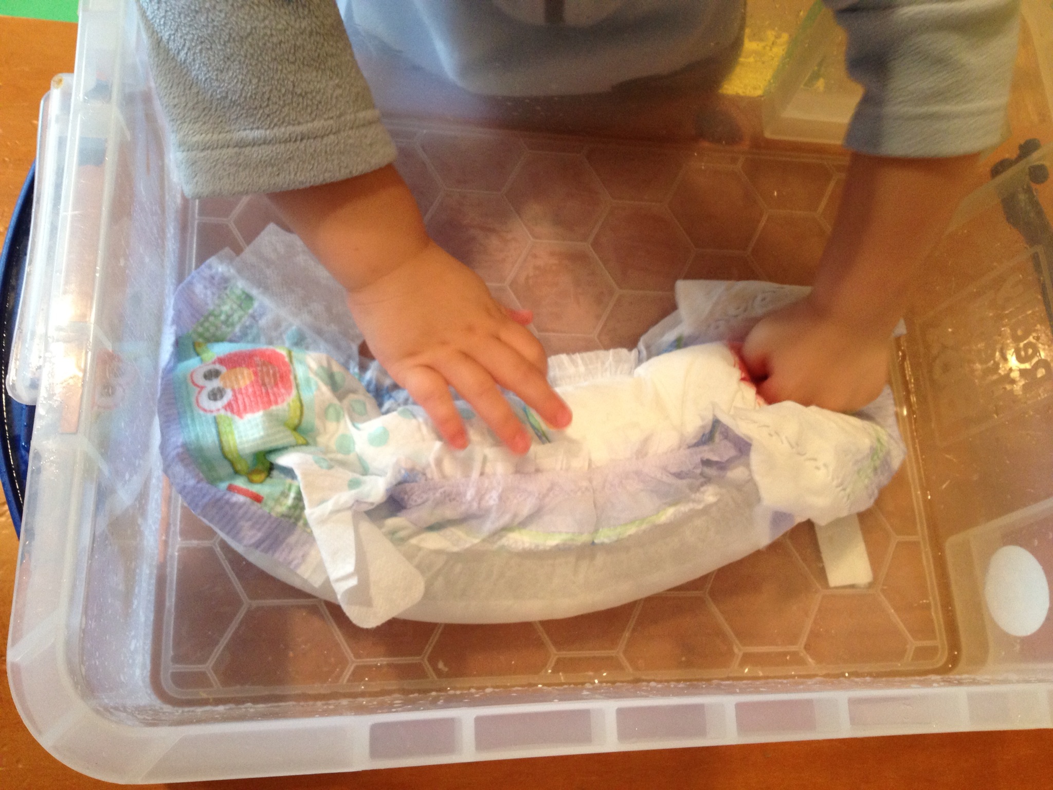 Of course we will not keep children in their diaper until it’s soaking but, it was great addition to our many experiments. As usual the children were intrigued by yet another science experiment:)