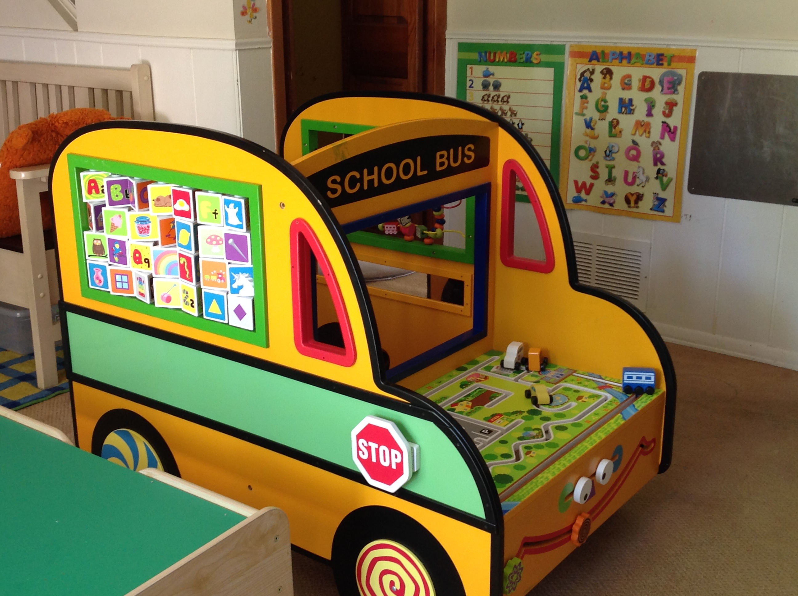 This writing area allows children to use paper, crayon, chalk, pencils and markers. Books and ABC blocks are also provided in this area.