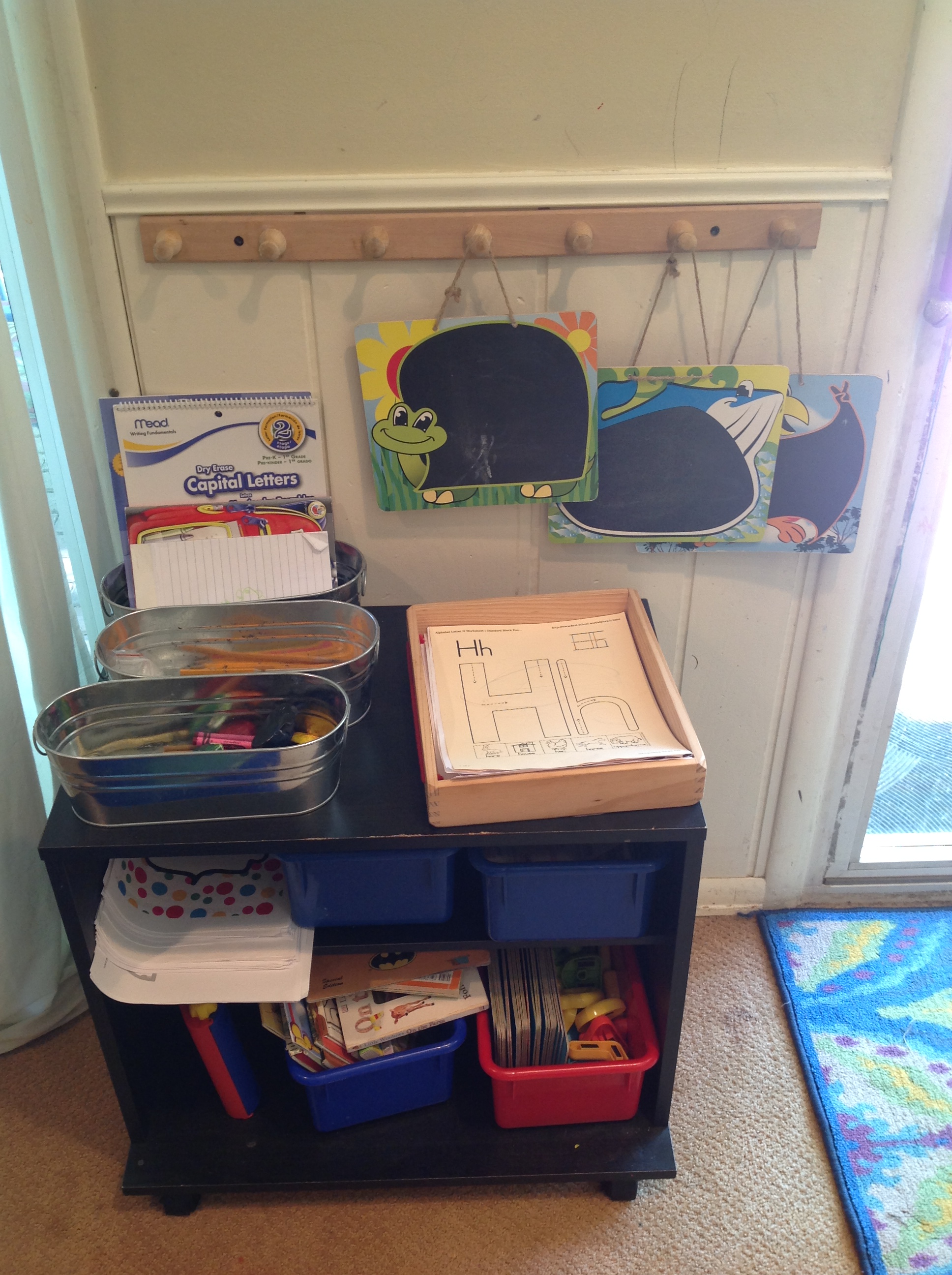 I keep my curriculum books, benchmark information, lesson plans, books based on themes and board games in this area. Some are stored in our Laundry room also. Our laundry room if filled with school stuff.