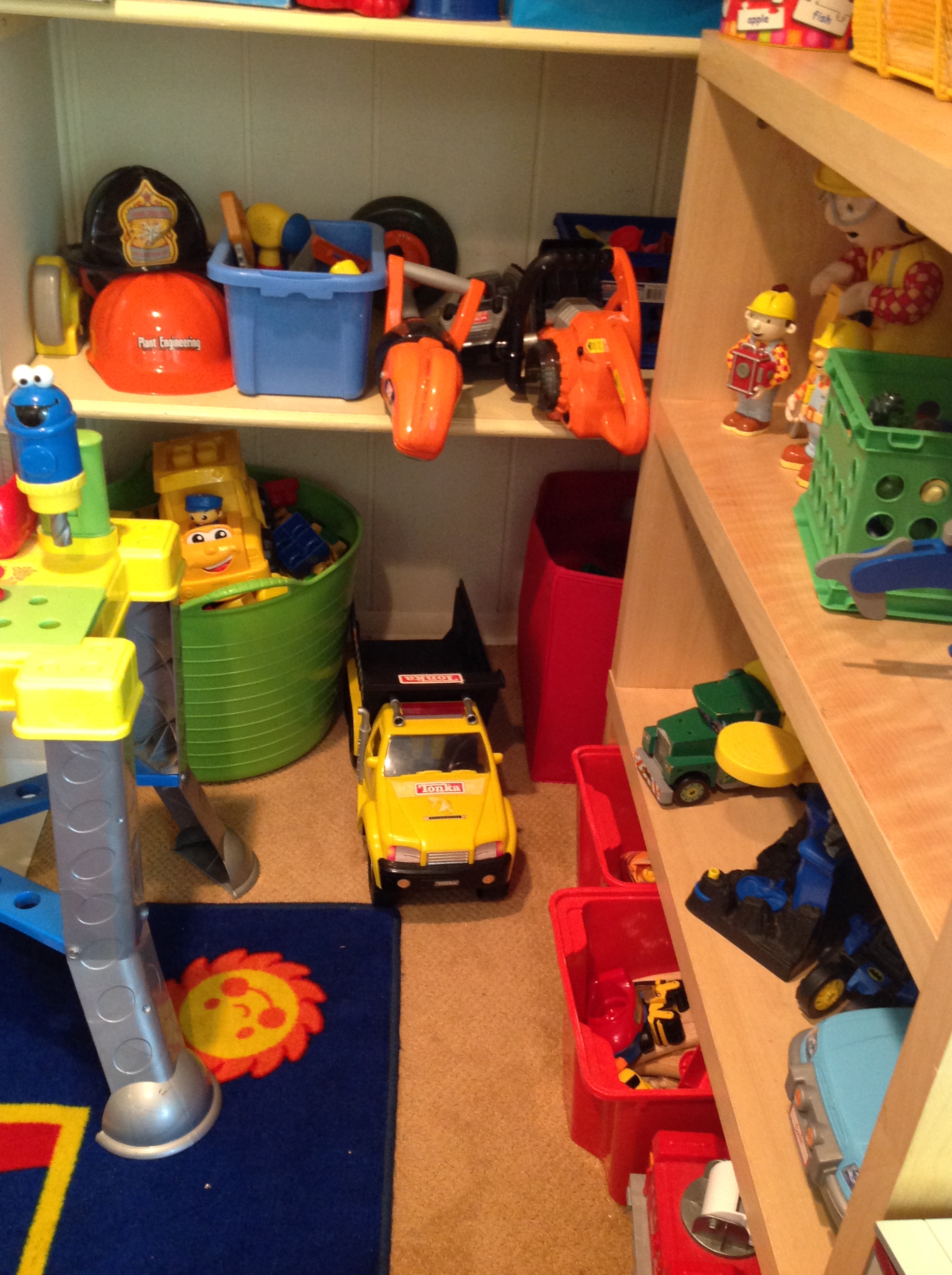 Children love to sit in this cozy area which also serves as one of our main reading spot. Everyone needs time away – maybe a little peace and quiet or relaxation. It also serves as the area for Movie Fridays. The wall above is where their beautiful art pieces are displayed. Most are however sent home for their families to showcase. The bench is multi-functional and serves as the storage area for the music pieces – cymbals, maracas, drums, etc. The plastic container underneath the bench is our discovery box: cornmeal, rice, pom poms, snow, dinosaur fossils are some of the many items rotated in the container.