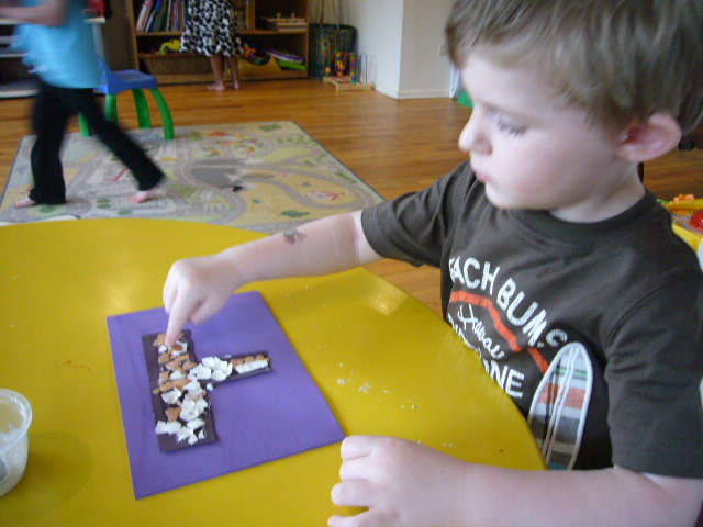 P1110271 Published June 9, 2012 at 640 × 480 in Offerings The Eggshell Mosaic. Each child made the initial of their names by brushing on glue to the paper then sticking the eggshells on. Like Loading...