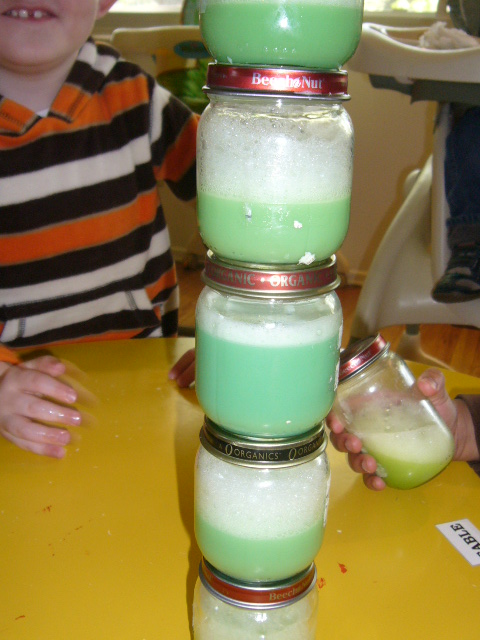 Our science project of mixing water, oil and soap. We then added some food coloring so the children could see how he bubbles were swirling with the oil. They then wanted to see how well the jars could balance on top of each other. They always enjoy the science sessions.